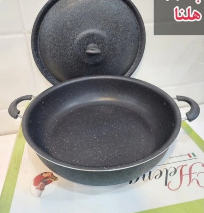 تابه تک هلنا سایز ۳۴ جنس بدنه داخلی گرانیتی و رنگ مشکی بدنه بیرونی مشکی چروک جنس درب فلزی جنس دسته باکالیت